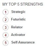 Based on my understanding of myself I thought this assessment was spot on. I also had my wife Lindsay take the assessment. Though she had none of the strengths that I ended up with we both thought her results were very accurate as well. See a list of strengths, or take the StrengthFinders assessment yourself.